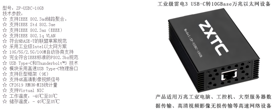 ZP-USBC-10GBase万兆以太网模块采用最新Thunderbolt? 3 的技术,传输速率高达40Gbps,Thunderbolt?3 技术相当于Thunderbolt 二代技术的二倍传输速率,并为八倍USB3.0 的传输效能。用户可通Thunderbolt? 3技术和USB-C接口数据线连接扩展出标准的万兆RJ45-LAN端口,采用Intel芯片,性能稳定可靠,抗震,抗压,防尘,防摔等特点。产品广泛应用于大型服务器中心机房、研华工控机、工业电脑、工业触摸屏、万兆交换机、万兆收发器、4K高清影像视频信号传输等以太网高速传输要求。。